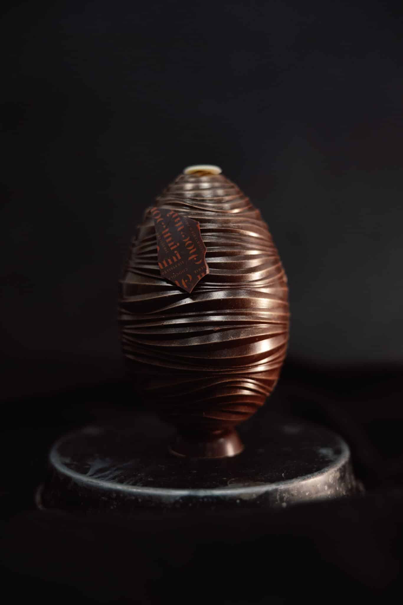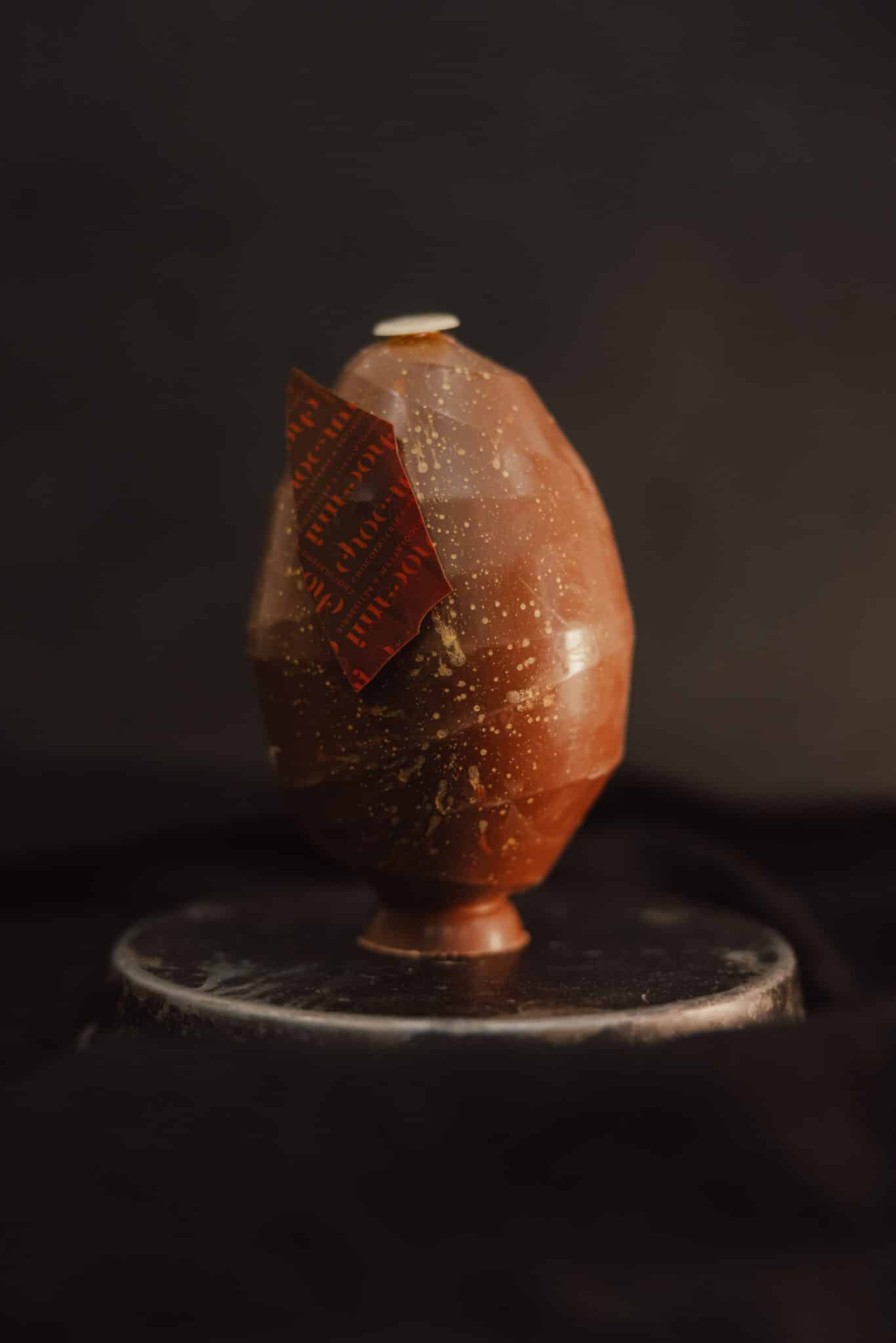 Dieses handgegossene Ei (16cm hoch) aus feinster Vollmilchkuvertüre ist nicht nur optisch ein Highlight, sondern überzeugt auch mit einer köstlichen Füllung: zartschmelzendes dunkles Nougat und hausgemachten knusprigen Waffelstückchen.